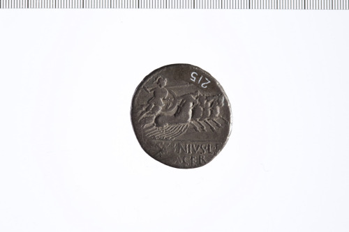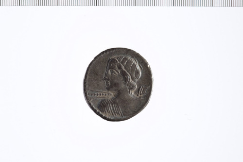 Busto di Apollo visto da dietro con testa rivolta a s. e con fulmine nella mano d. Cerchio perlinato.