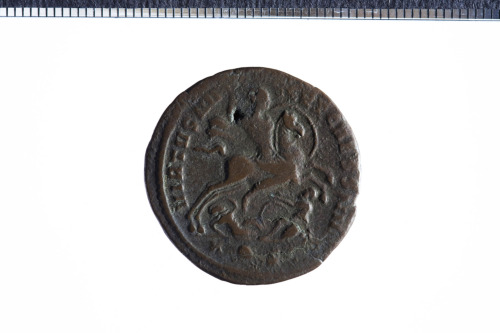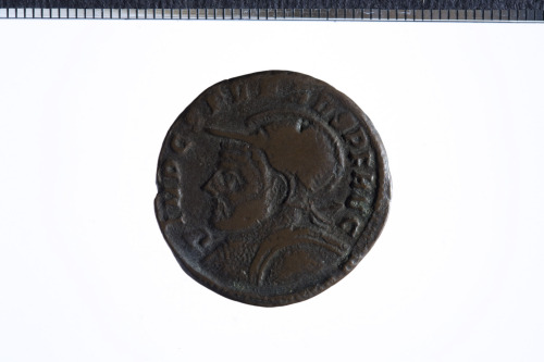 Busto laureato, elmato e corazzato di Severo a s. con lancia e scudo; contorno perlinato.