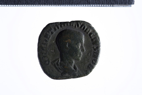 Busto a testa nuda di Herennio Etrusco a d., con corazza (?) e paludamentum, di tre quarti di spalle; contorno perlinato (?).