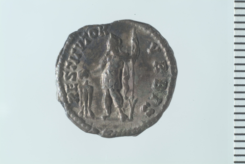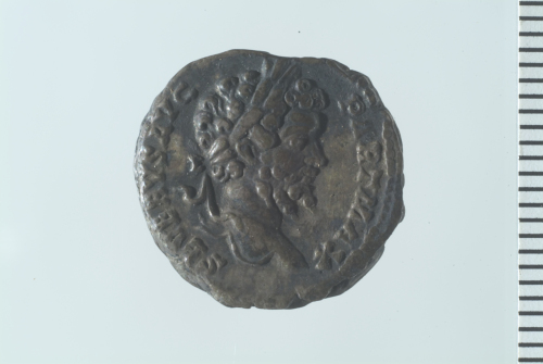 Testa laureata di Settimio Severo a d.; contorno perlinato.
