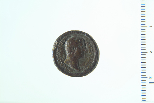 Testa nuda di Adriano a d.; contorno perlinato.