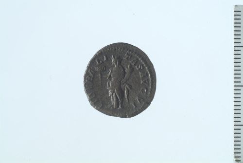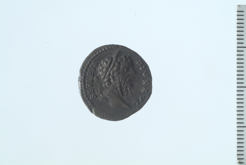 Testa laureata di Settimio Severo a d.; contorno perlinato.