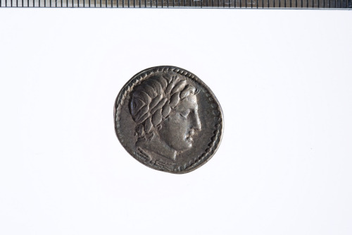 Testa con corona di quercia di Apollo a d.; sotto, un fulmine; c.p.