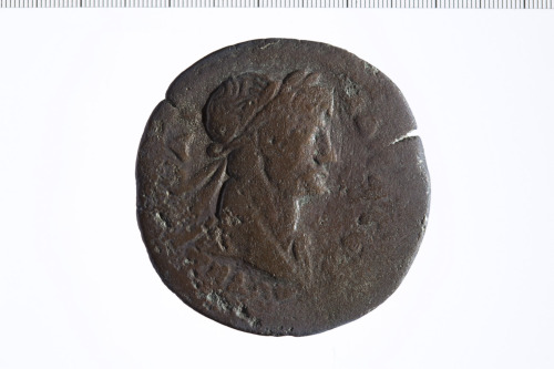 Busto laureato di Adriano a d., paludato, corazzato, di tre quarti, in avanti.