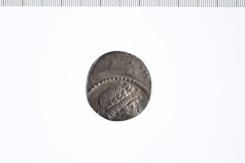 Testa laureata di Apollo a d. Bordo perlinato.