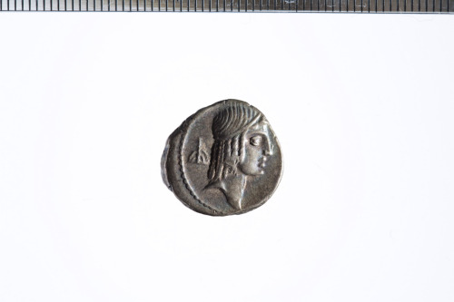 Testa di Apollo a d. con i capelli fermati da un nastro. Bordo perlinato.