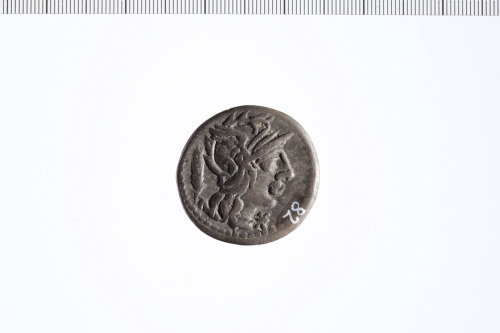 Testa di Roma con elmo a d. A s. spiga di grano. Contorno perlinato.