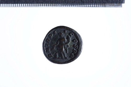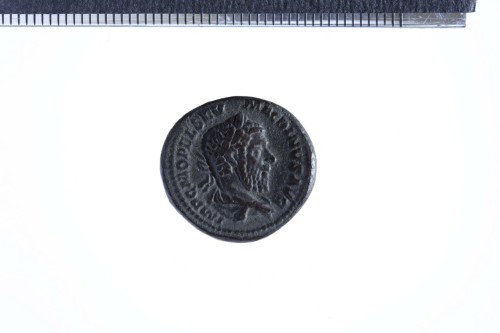 Busto laureato e paludato di Macrino a d., di tre quarti di spalle; contorno perlinato.