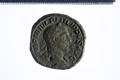 Busto laureato di Filippo I a d., con corazza (?) e paludamentum, di tre quarti di spalle; contorno perlinato.