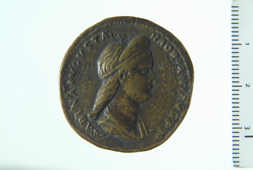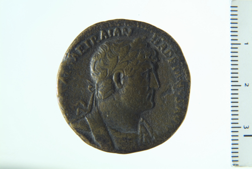 Busto laureato di Adriano a d., con corazza, drappeggiato sulla spalla s.; contorno perlinato.