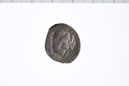 Teste dei Dioscuri a d. con i pilei sormontati da due stelle e decorati con due nastri. Bordo perlinato.