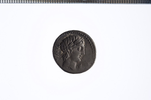 Testa laureata di Apollo a d.; davanti, un simbolo di controllo non identificabile, forse civetta?; c.p.