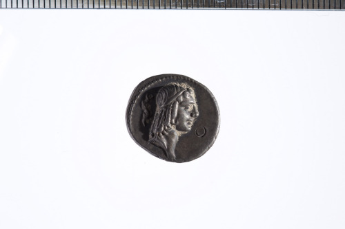 Testa di Apollo a d. con i capelli fermati da un nastro. Bordo perlinato.