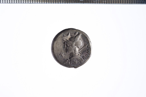 Busto di Roma a s. con elmo piumato e scudo nella s., con la d. regge lancia posata sulla spalla d.; sopra crescente, davanti simbolo di valore X barrato; c.p.