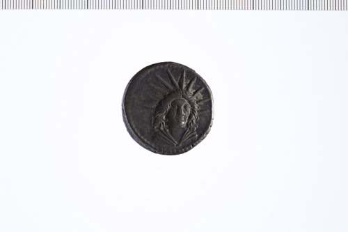 Busto frontale e drappeggiato del Sole con corona radiata. Bordo perlinato.