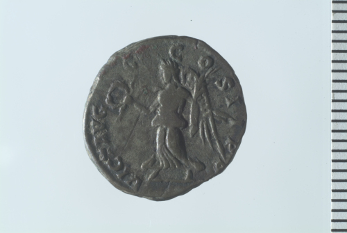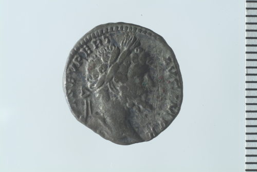 Testa laureata di Settimio Severo a d.; contorno perlinato.