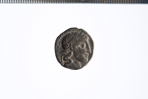 Testa laureata di Apollo a d.; sotto il mento un simbolo o lettera di controllo non meglio identificabile; c.p.