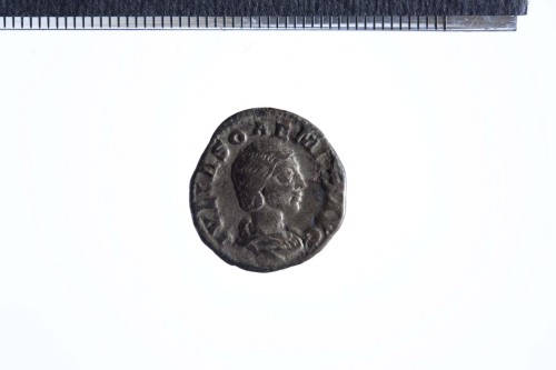 Busto drappeggiato di Giulia Soemia a d., di tre quarti in avanti; contorno perlinato.
