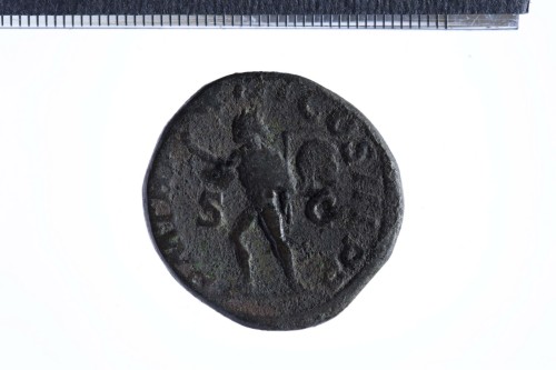 Busto laureato di Alessandro Severo a d., con paludamentum, di tre quarti in avanti; contorno perlinato.