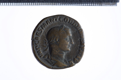 Busto laureato di Gordiano II a d. con corazza (?) e paludamentum, di tre quarti di spalle; contorno perlinato.