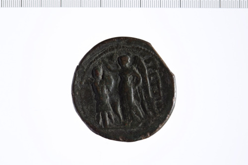 Testa di Ares elmata a s. con dietro due globetti.