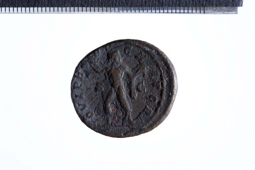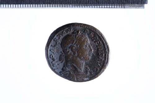 Busto laureato di Alessandro Severo a d. con corazza e paludamentum, di tre quari in avanti; contorno perlinato.