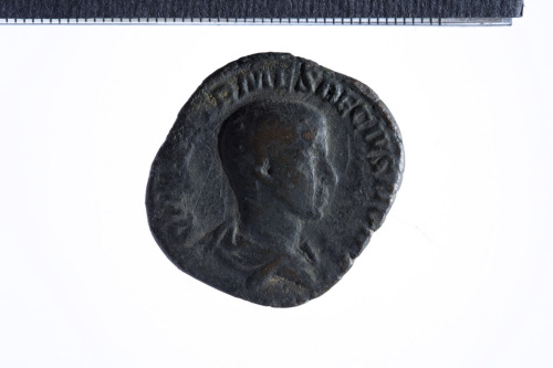 Busto a testa nuda di Herennio Etrusco a d., con corazza (?) e paludamentum, di tre quarti di spalle; contorno perlinato (?).