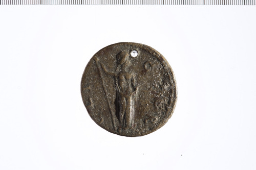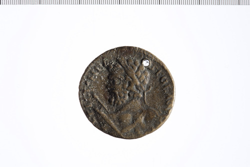 Busto di Settimio Severo laureato con scudo e lancia visto da dietro.
