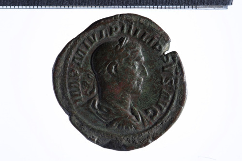 Busto laureato di Filippo I a d., con corazza e paludamentum, di tre quarti di spalle; contorno perlinato.