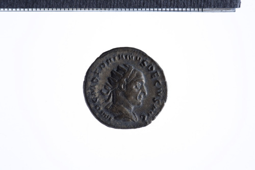 Busto radiato di Traiano Decio a d. con corazza (?) e paludamentum, di tre quarti di spalle; contorno perlinato.