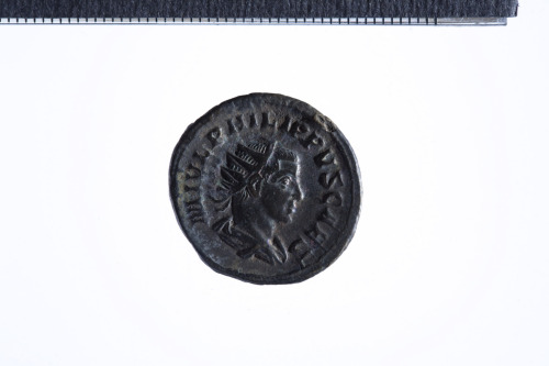 Busto radiato di Filippo II a d. con corazza (?) e paludamentum, di tre quarti di spalle; contorno perlinato.