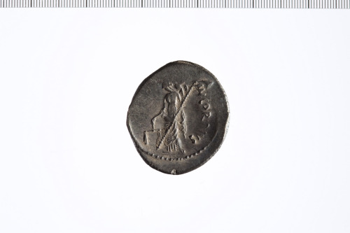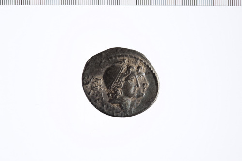 Teste dei Dioscuri a d. con i pilei sormontati da due stelle e decorati con due nastri. Bordo perlinato.