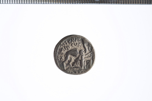 Cammello sellato a d. Davanti figura inginocchiata, con mantello e lunga tunica, che tiene nella mano s. le redini e con la d. un ramoscello d'ulivo ornato con nastro. Bordo perlinato.