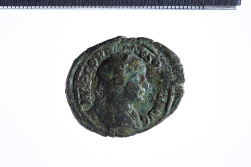 Busto laureato di Gordiano III a d. con corazza (?) e paludamentum, di tre quarti di spalle; contorno perlinato.