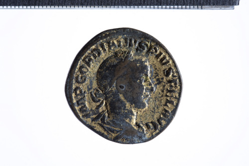 Busto laureato di Gordiano III a d. con corazza (?) e paludamentum, di tre quarti di spalle; contorno perlinato.