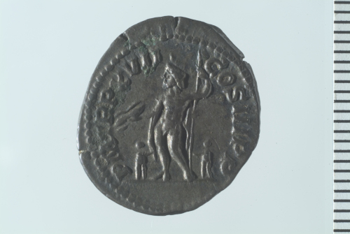Testa laureata di Settimio Severo a d.; contorno perlinato.