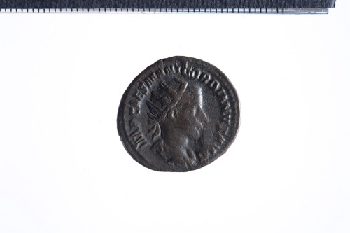 Busto radiato di Gordiano III a d. con corazza e paludamentum, di tre quarti di spalle; contorno perlinato.