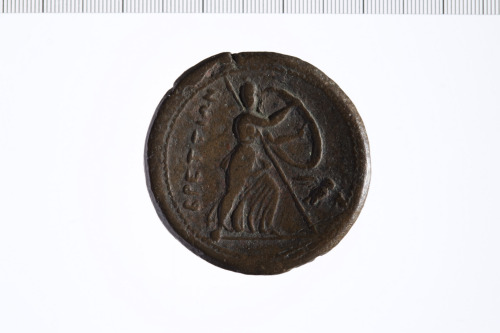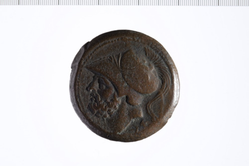 Testa di Ares elmata a s.; elmo decorato con pegaso.