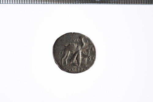 Cammello sellato a d. Davanti figura inginocchiata, con mantello e lunga tunica, che tiene nella mano s. le redini e con la d. un ramoscello d'ulivo ornato con nastro. Bordo perlinato.