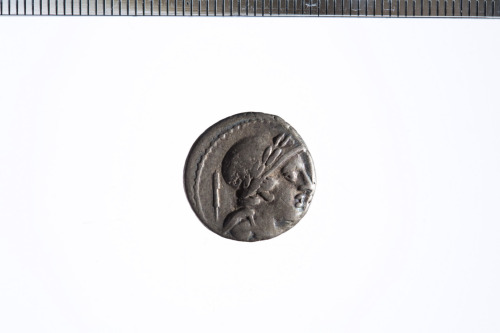 Busto elmato e laureato a d.; dietro, un simbolo che potrebbe essere interpretato come uno stilus(?); c.p.