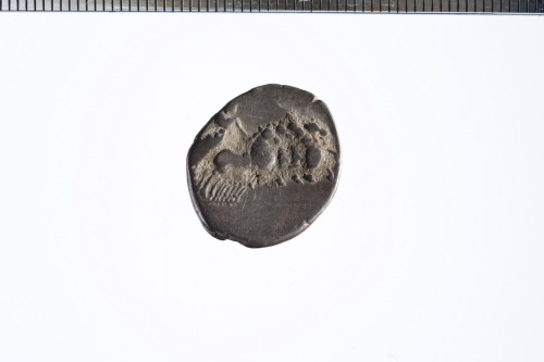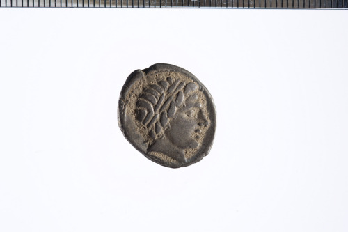 Testa con corona di quercia di Apollo a d.; sotto, un fulmine; c.p.