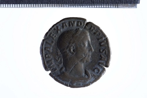 Busto laureato di Alessandro Severo a d., con corazza (?) e paludamentum, di tre quarti in avanti; contorno perlinato.