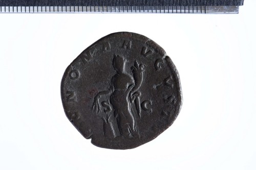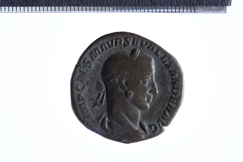 Busto laureato di Alessandro Severo a d., con paludamentum, di tre quarti di spalle; contorno perlinato.
