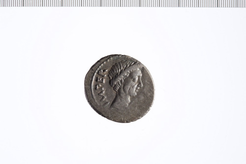 Testa laureata di Giulio Cesare a d. Bordo perlinato.