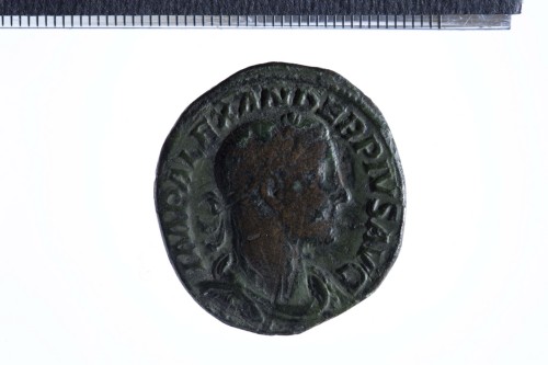 Busto radiato di Alessandro Severo a d., con paludamentum; contorno perlinato.