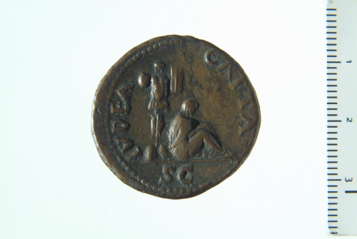 Testa laureata di Vespasiano d.; contorno perlinato.