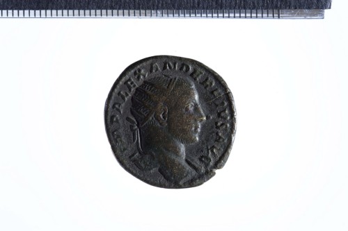 Busto laureato di Alessandro Severo a d. con paludamentum sulla spalla s. (?); contorno perlinato.