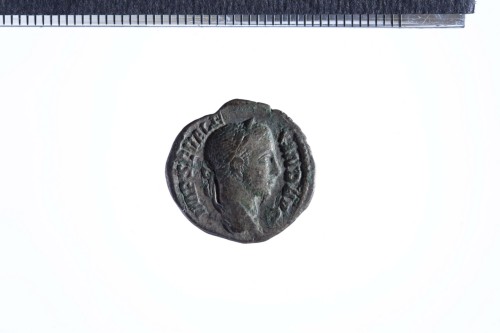 Testa laureata di Alessandro Severo a d.; contorno perlinato.