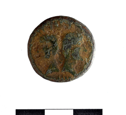 Testa di Agrippa che indossa la corona con i rostri a sin.e di Augusto barbuto a d.; [IMP DIVI F]