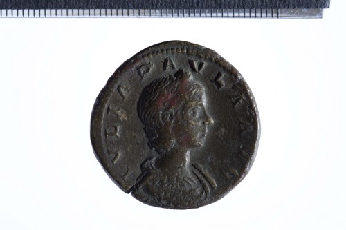 Busto drappeggiato e diademato di Giulia Paola a d., di tre quarti in avanti; contorno perlinato.